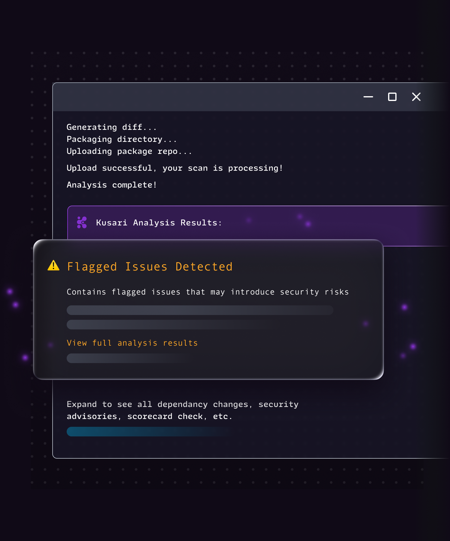 Kusari does a deep analysis on the code you don’t control, so you can still move fast.
